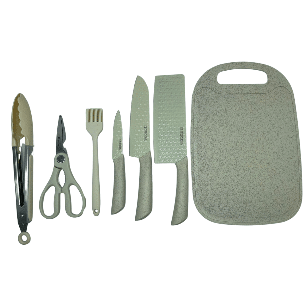 - Incluye: Cuchillo de Chef de 8″, cuchillo para trinchar de 8″, acero para afilar cuchillos y tabla de cortar.