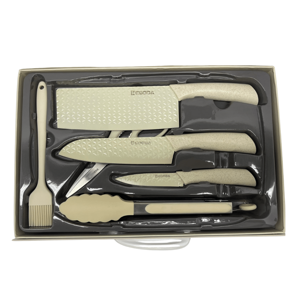 El juego de cuchillos de cocina X7 piezas incluye 5 cuchillos con cubiertas cerámicas, una tabla de cortar y un afilador. Sus características son: